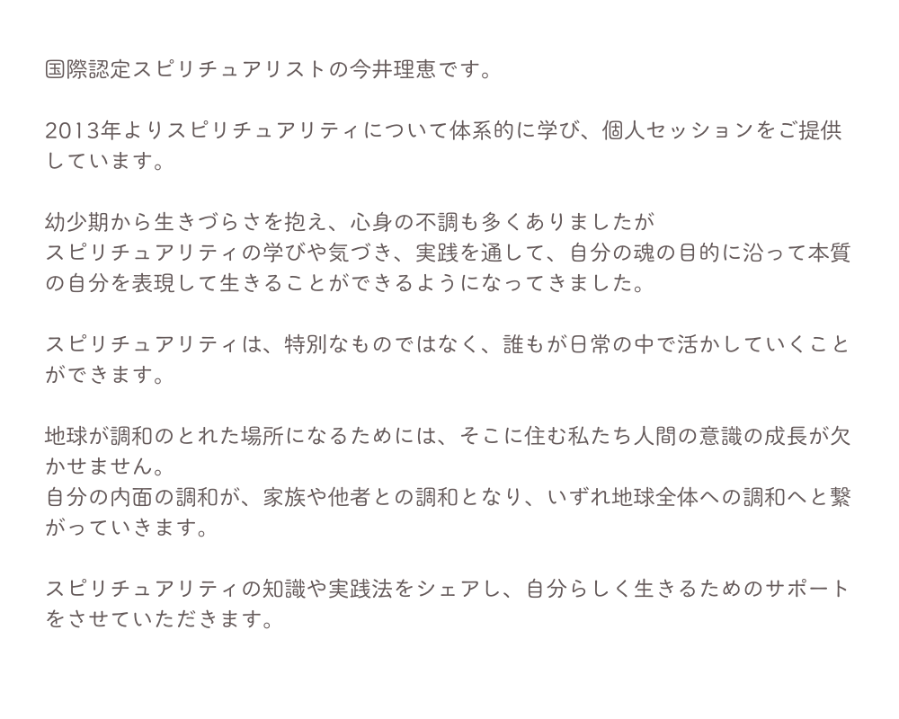 国際認定スピリチュアリストの今井理恵です。