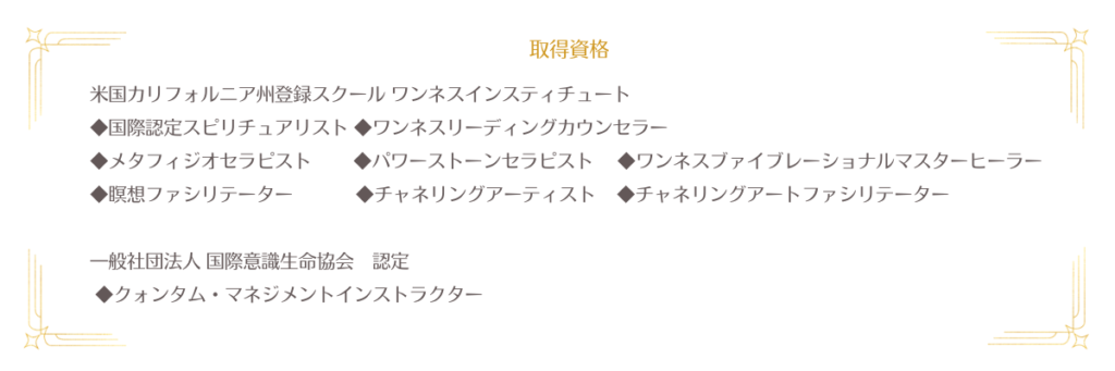 ◆国際認定スピリチュアリスト ◆ワンネスリーディングカウンセラー ◆メタフィジオセラピスト